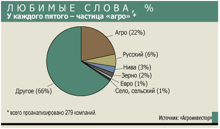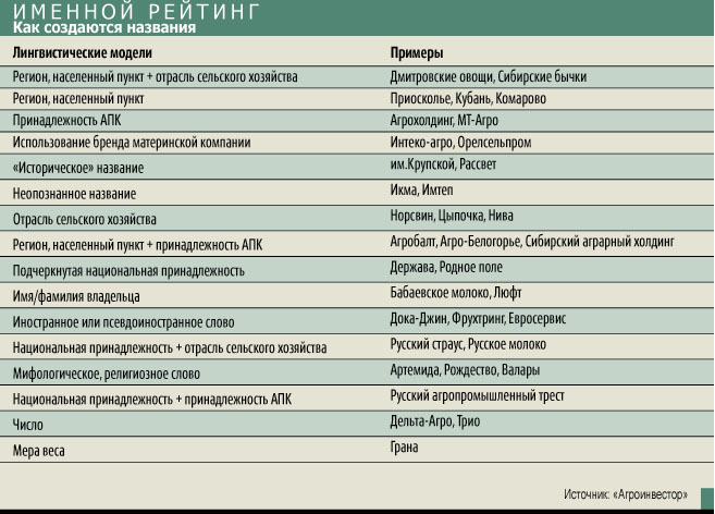 Многие компании (см. таблицу) стремятся подчеркнуть свою принадлежность к АПК, добавляя к названию частицу «агро», указание на отрасль сельского хозяйства (молоко, свинина) или своей продукции (овощи, картофель). Профессиональная идентификация стала популярной после дефолта 1998 года, поясняет Коро. Она позволяла бизнесу стать более заметным для государственных и банковских структур. Из-за несоответствия подчеркнутой в названии отраслевой принадлежности профилю компании могут возникнуть недоразумения, рассказывал «Агроинвестору» Александр Аладушкин, гендиректор «Аладушкин Групп».