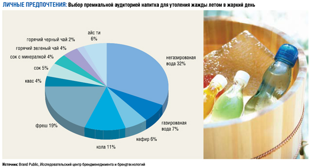Приоритеты очевидны – питьевая вода доминирует над всеми 39% (негазированая – 32%, газированая – 7%), затем следуют свежевыжатые соки – 19%, кола (здесь подразумеваются оба марочных титана) – 11%, сок с минералкой, чаи во всех цветах и состояниях нагретости или охлажденности (лидирует айс ти, но серьезны позиции и у горячего и зеленого) и миксы из минералки с соком. Но главное – квас все же присутствует, несмотря на обывательское журналистское мнение о том, что премиальная аудитория вообще не включает в свой рацион традиционалистские народные напитки! 4 процента респондентов заявили о том, что утолят жажду этим продуктом!